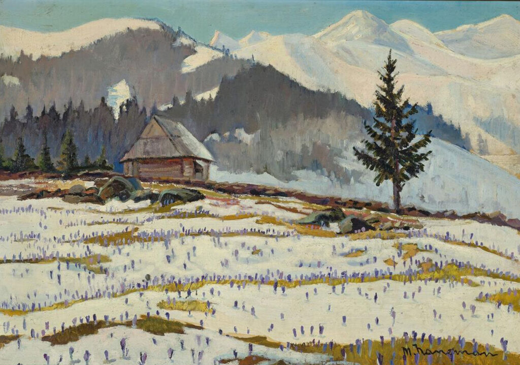 Obraz Maksa Hanemana „Krokusy na hali” (olej na tekturze, 49×70 cm) pochodzi ze zbiorów Muzeum Tatrzańskiego w Zakopanem (S/2756/MT)