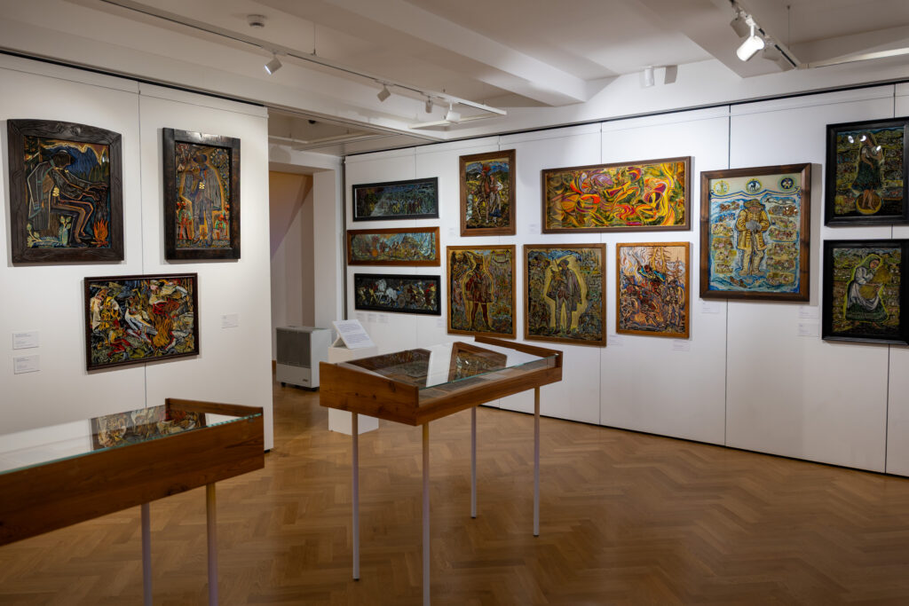 Przechodząc do kolejnych sal wystawy, czeka Was niesamowite spotkanie z podhalańskim folklorem. Pełne żywych kolorów opowieści o codziennym życiu górali czy legendarnych zbójnikach – również w formie obrazów malowanych na szkle, tworzą niezwykłą opowieść o kulturze Podhala. Wśród prac Władysława Trebuni-Tutki znajdziecie malarskie przedstawienia sianokosów, wypasu owiec czy prac domowych, jak również zabaw w karczmie, góralskich wesel czy uroczystości. Artysta często podejmuje też temat zbójników – ich napadów na zamki czy wozy należące do bogatych panów, jak również motyw tańca góralskiego przy ognisku, który zobaczycie zarówno w realistycznym, jak i nieco abstrakcyjnym ujęciu.
